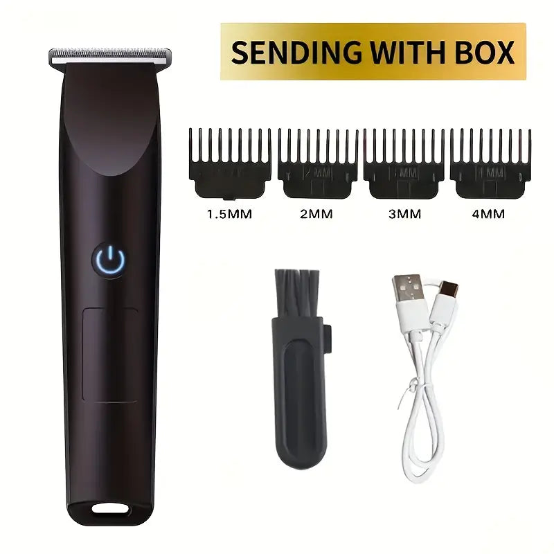 The trimmer features a powerful motor and stainless-steel blades that glide smoothly through any hair type without pulling or irritation. Its ergonomic handle gives you a solid grip, while the USB-charging system makes it convenient to power up anywhere — no bulky chargers needed.